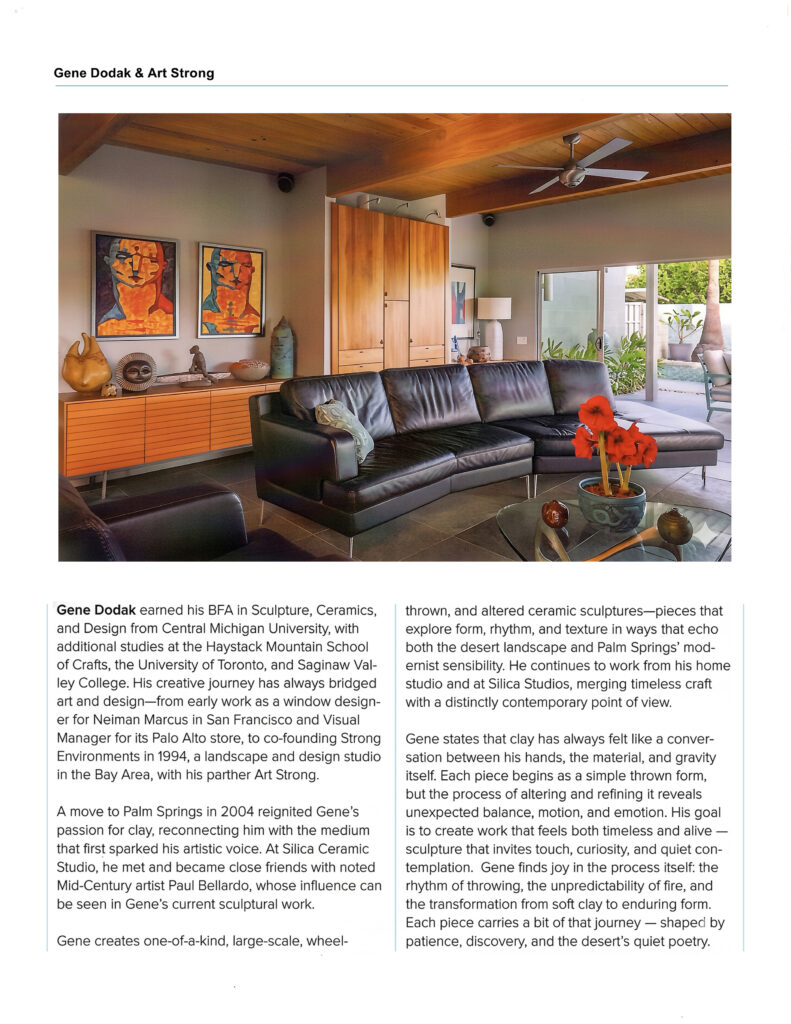 If you find yourself inspired – or visiting the Palm Springs area, we invite you to contact us about a private tour of Gene Dodak’s studio, where you can view current works and available pieces. Experience desert modernism as it lives and evolves today.
